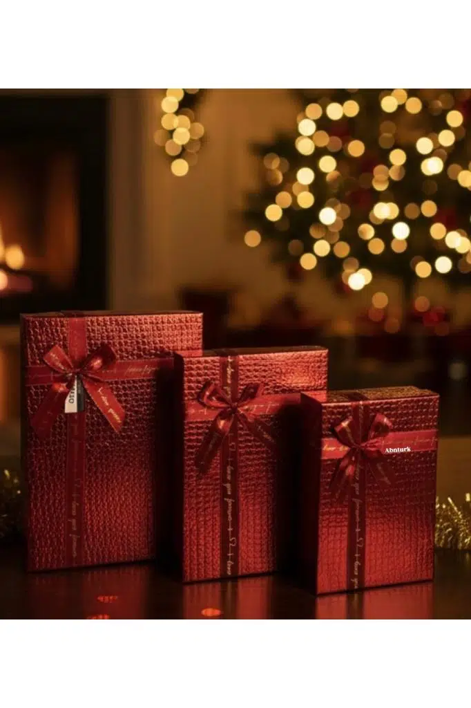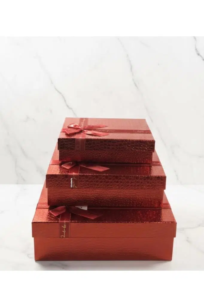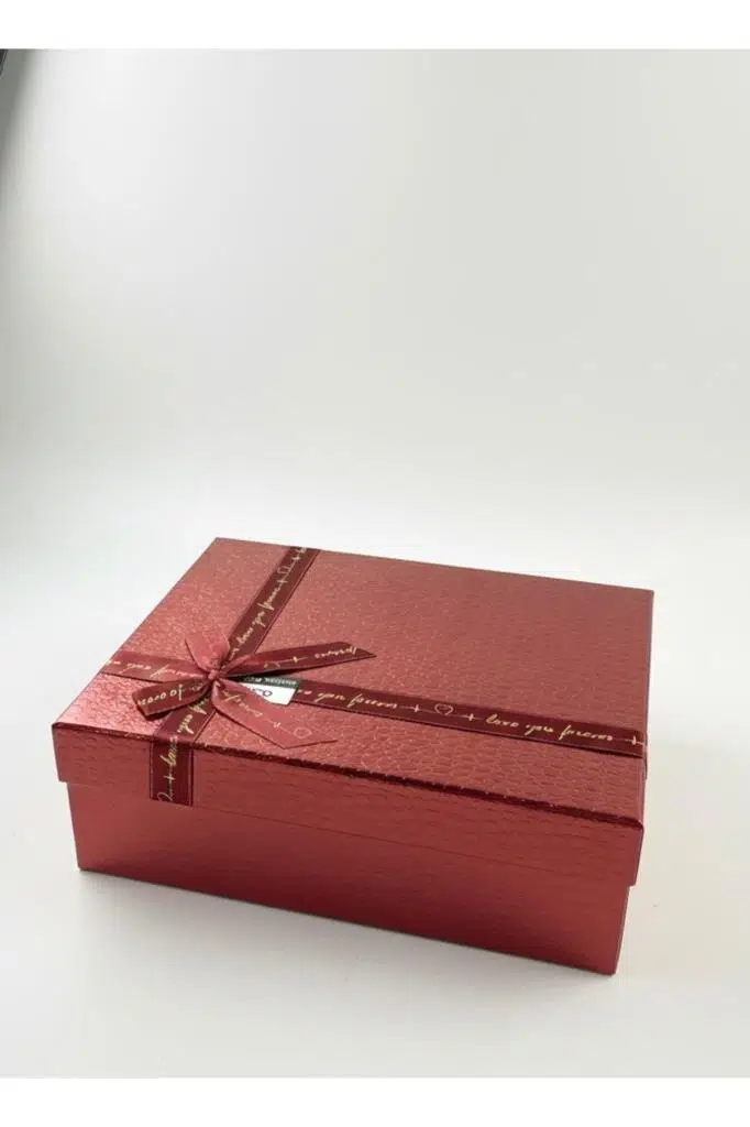 1 Adet Kırmızı Deri Görünümlü Parlak Kabartmalı Büyük Dikdörtgen Kurdeleli Hediye Kutu 28.5x20.5cm097
