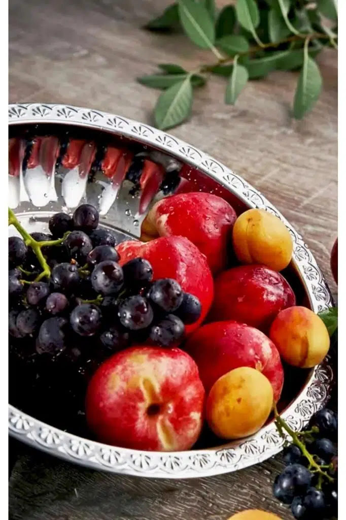 Ürün Boyutu: 24 cm ; Ürün Yüksekliği: 4 cm ; 430 Kalite Paslanmaz Çelikten imal edilmiştir. ; Meyve - Salata - Patlamış Mısır vs. Ürünler için kullanıma uygundur. ; Çevresinde kabartma desenler bulunur. ; Kenarları kesilmeyi engellemek için kavislidir. ; Çelik hammadde kullanılarak üretilmiştir. 430 Çelik değerine sahiptir. 430 paslanmaz çelikler nikel ve molybden içermedikleri için 300 serisi paslanmaz çeliklere oranla fiyat açısından daha uygunlardır. Bu kalitedeki paslanmazlar kullanıldığı malzemelerde iyi bir yüzey görünümü sağlarlar. 430 kalite paslanmaz çelik 1.4016 paslanmaz çelik olarak da adlandırılmaktadır.. Yıkamalara karşı yapısı gereği dayanıklıdır, solma veya kararma yapmaz. Çevresinde bulunan kabartma desenler modern bir görünüm sağlar.