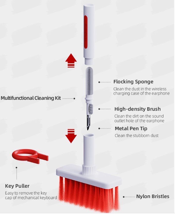 Sünger kulaklık kablosuz şarj durumunda toz temizleyebilirsiniz. Fırça, kulaklığın ses çıkış deliğindeki kiri temizleyebilir. Metal kalem ucu inatçı tozu temizleyebilir